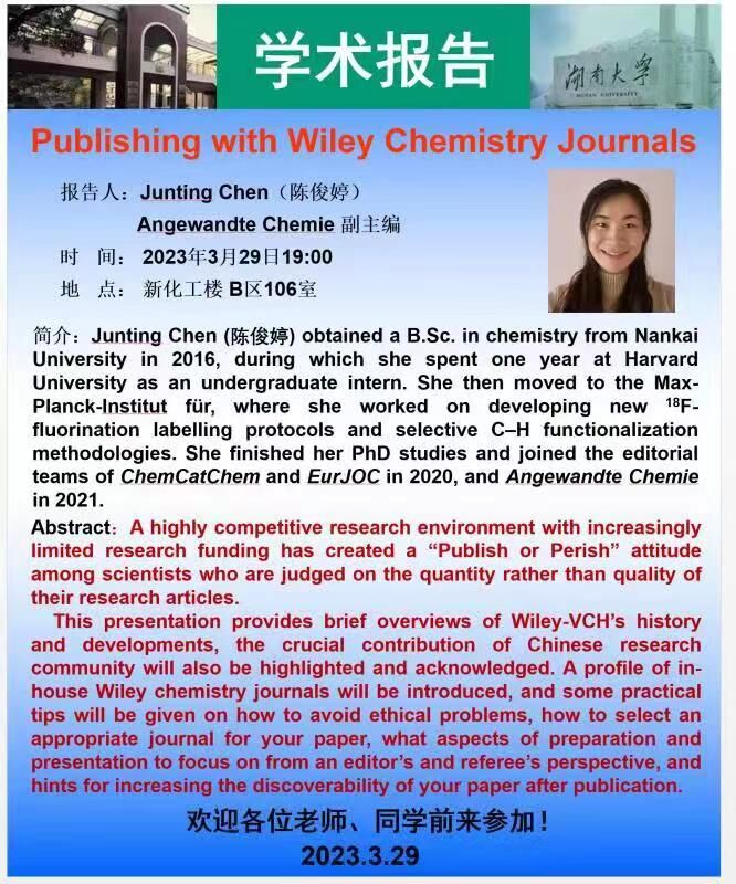 學術地點 新化工樓B區106室 主講人 Junting Chen(陳俊婷) Angewandte Chemie副主編