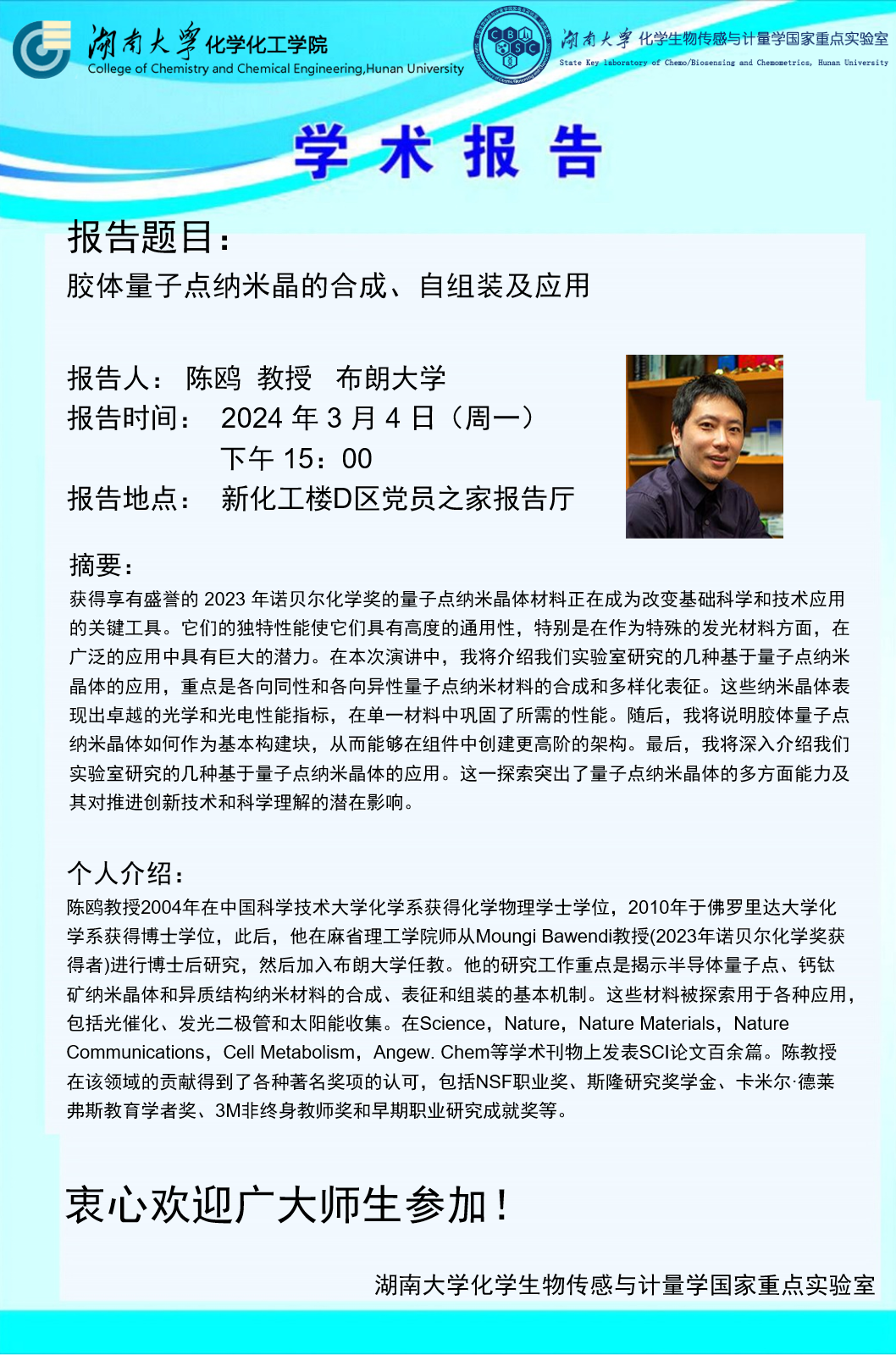 學(xué)術(shù)地點(diǎn) 新化工樓D區(qū)黨員之家報告廳 主講人 陳鷗 教授 布朗大學(xué)