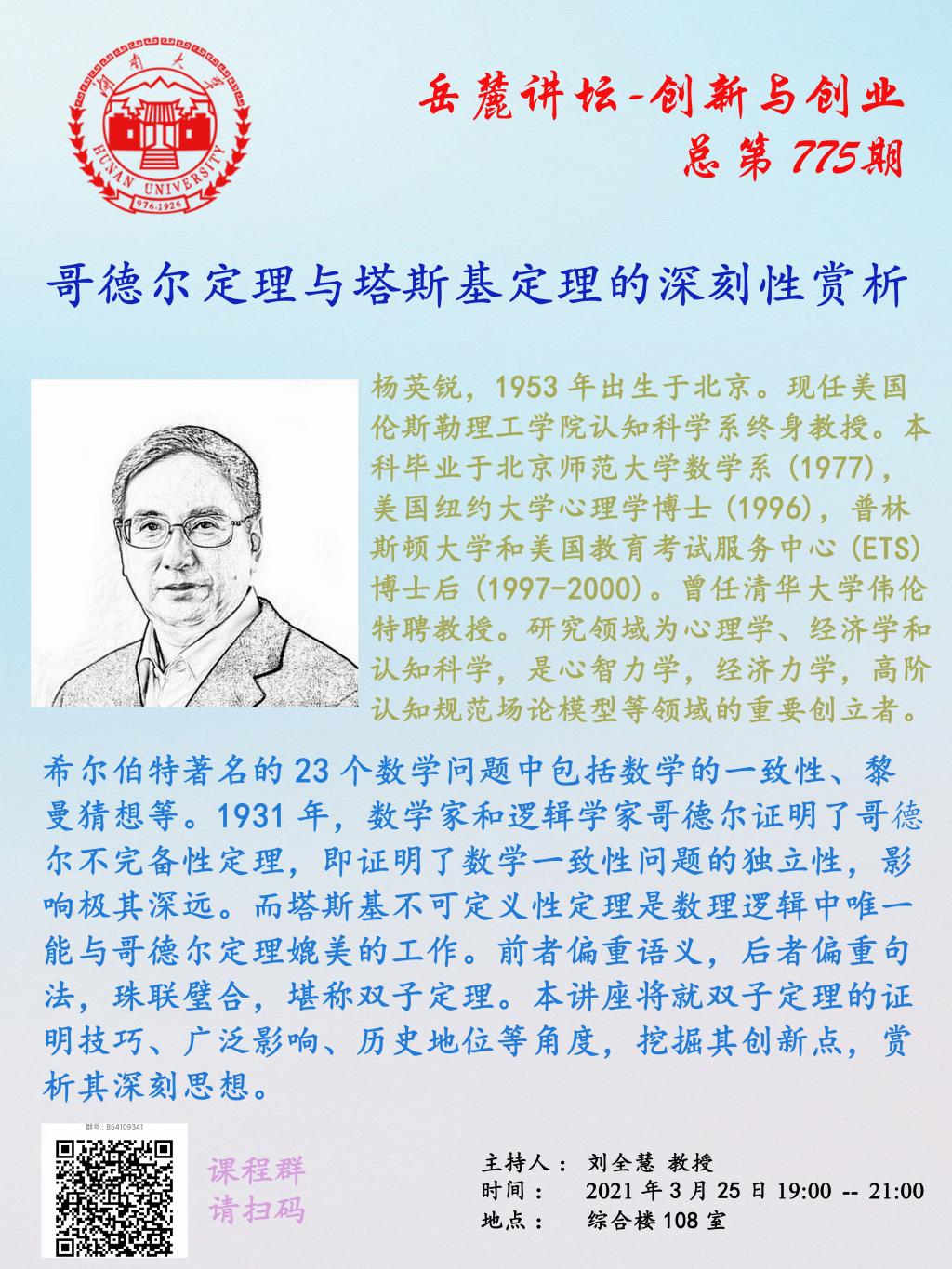 希爾伯特著名的23個數(shù)學(xué)問題中包括數(shù)學(xué)的一致性、黎曼猜想等。1931年,數(shù)學(xué)家和邏輯學(xué)家哥德爾證明了哥德爾不完備性定理,即證明了數(shù)學(xué)一致性問題的獨立性,影響極其深遠(yuǎn)。而塔斯基不可定義性定理是數(shù)理邏輯中唯一能與哥德爾定理媲美的工作。前者偏重語義,后者偏重句法,珠聯(lián)璧合,堪稱雙子定理。本講座將就雙子定理的證明技巧、廣泛影響、歷史地位等角度,挖掘其創(chuàng)新點,賞析其深刻思想。