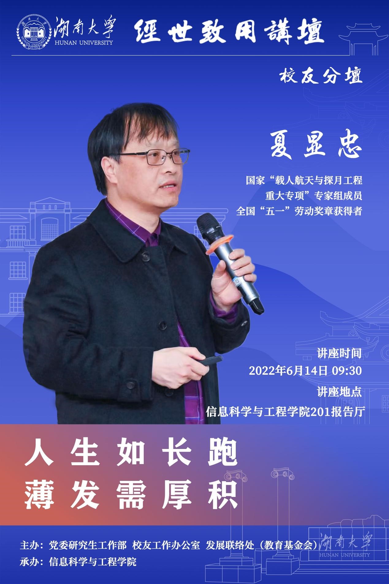 6月14日9:30邀請全國“五一”勞動獎章獲得者、國家“載人航天與探月工程重大專項”專家組成員夏顯忠校友于信息科學與工程學院201報告廳作“人生如長跑、薄發需厚積”主題報告,歡迎同學們前來聽講。